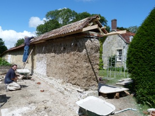 Here is an example of the many chalk cob repairs to the damaged cob wall. Many of the vertical cracks were also pinned.