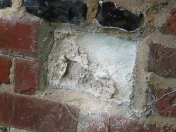 Above, a photo of the rebuilt flint plinth using coursed chalk blocks which we cut on site, and the flint bands which no longer have cement holding them together.