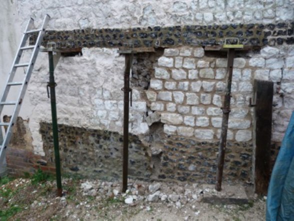 The photo above shows the wall being supported and re built. Note that we were able to make use of the flint band with its cement to provide strength for the strongboy.