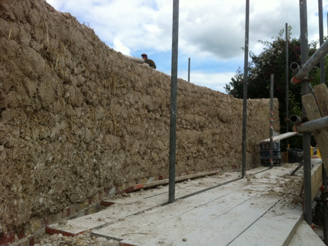 As the site was very tight for space, over 70 tons of cob was brought to site and laid as mass cob.
