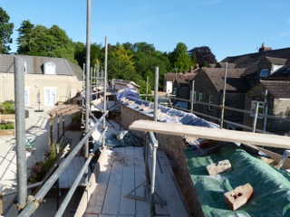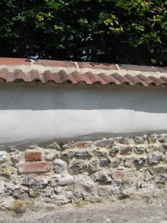 Furthermore the roof of the remaining wall was also a problem; although only recently changed, no attention had been paid to the drip lines and this was a major source of water penetration into the wall. This wall also had a hard render and a barrier paint which covered the plinth preventing the wall from drying out.